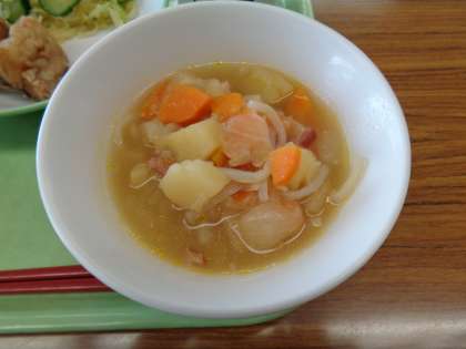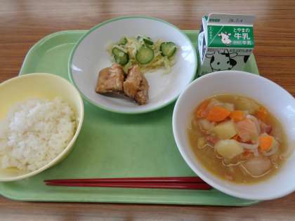 今日のメニューは、ごはん、牛乳、魚の梅風味かば焼き、あわせ合え、ベーコンとじゃがいものの煮物でした。美味しくいただきました。