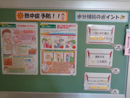 保健室前には、熱中症を防ぐための方法、水分補給のポイントがクイズ形式で掲示されています。正しく答えられるかな?