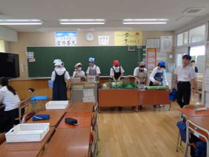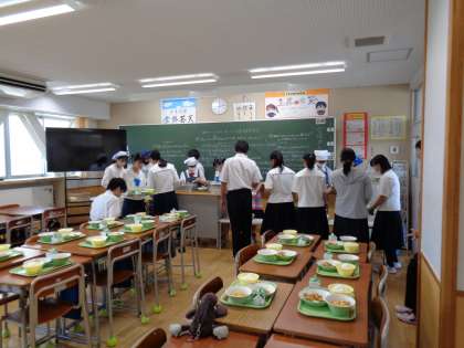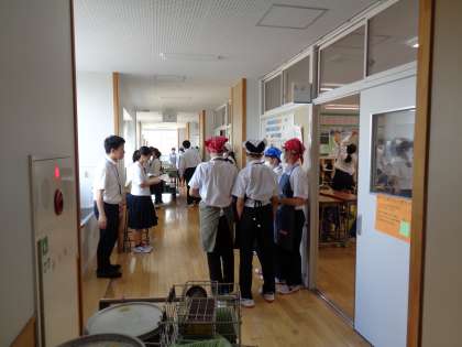 今日の給食時間に南給食センターから栄養職員の方が来校されました。3年生の配膳の様子や後片付けの様子を見ていかれました。