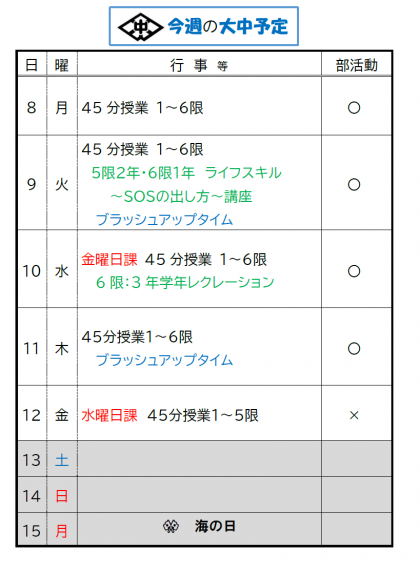 期末考査や社会に学ぶ「14歳の挑戦」等が終わり、1学期の学校生活もあと2週間程となりました。今週は1学期の自分の学習や生活を振り返り、夏休みに向けての新たな目標や計画をしっかりとたてましょう。