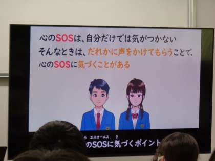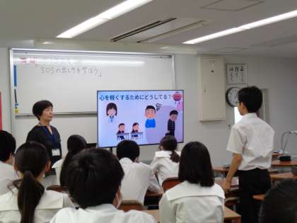 1、2年生が本校のスクールカウンセラーに、ライフスキル講座「SOSの出し方」の授業をしていただきました。つらいな、苦しいなと自分だけで悩むのではなく、身近にいる信頼できる大人や友達にSOSをだせるようになることの大切さを教えていただきました。