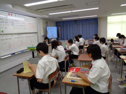 2年生は、2組が美術、1組が理科でした。どちらの学級も多目的室、理科室へ移動して授業をしています。理科では、オオカナダモも葉を観察していました。顕微鏡を上手に使っています。