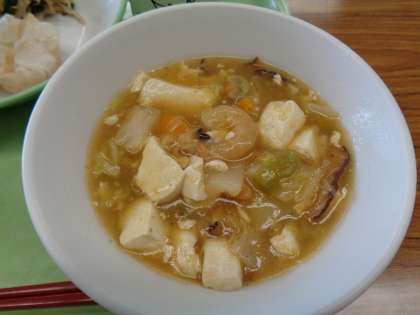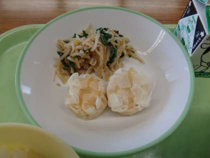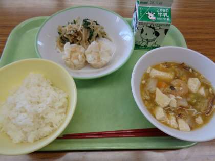 メニューは、ごはん、牛乳、にんじんシュウマイ、ナムル、えびと豆腐のうま煮でした。美味しくいただきました。