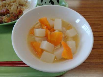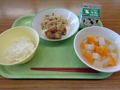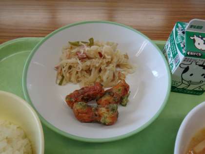 今日のメニューはごはん、牛乳、ちくわの磯辺揚げ、はりはりソテー、鶏肉とじゃがいもの南蛮煮でした。美味しくいただきましょう。