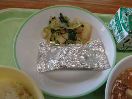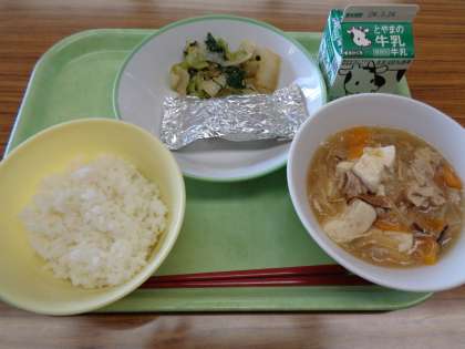 メニューは、ごはん、牛乳、さばの銀紙焼き、ごまびたし、豆腐の野菜あんかけでした。