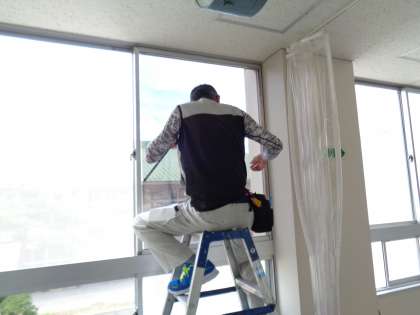 職員室前の廊下がとても暑いので、一部の窓に用務員さんにシートを貼っていただきました。日差しが弱くなりそうです。
