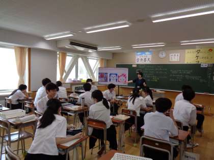 3年生は、技術家庭科と英語でした。技術家庭科では、マークについて相談していました。英語は、ALTの先生のクイズに答えていました。