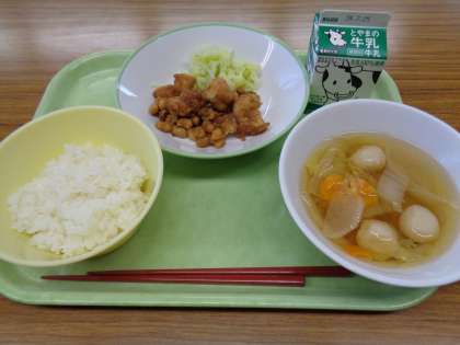 今日のメニューは、ごはん、牛乳、鶏肉と大豆の甘からめ、きざみ和え、つみれ汁でした。