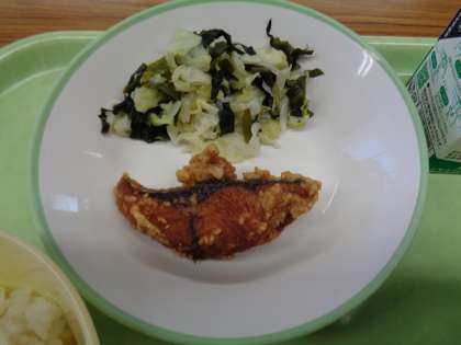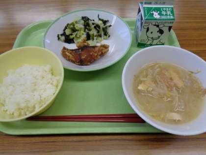 メニューは、ごはん、牛乳、魚の利久揚げ、酢の物、みそ汁でした。美味しくいただきました。明日は、1学期最後の給食です。