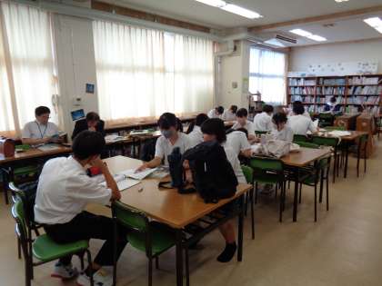図書室の様子です。部活動終了後に利用している人が多くいます。本を借りたり、学習したりしています。地域の方に見守りをしていただきました。ありがとうございます。