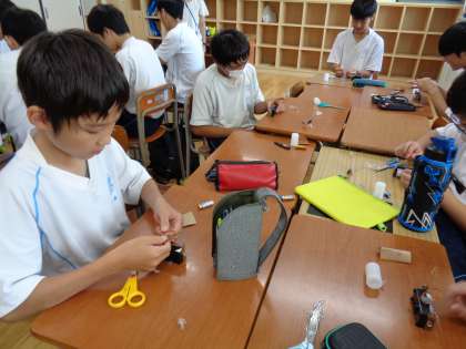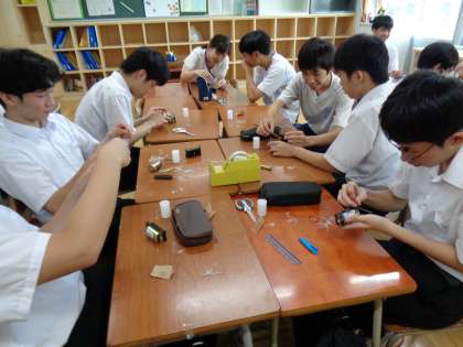 大中サマースクールの様子です。理科で、モーターづくりをしました。よく回転しています。