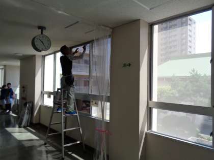 職員室前の廊下の日差しが強く、大変暑いので、用務員さんが窓にシートを貼ってくださいました。透明なシートですが、少し日差しが和らぎ、学習スペースも使いやすくなりました。
