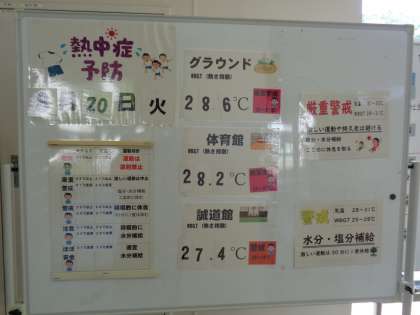毎日、暑さ指数を調べて掲示しています。参考にしながら、部活動の場所や練習内容を決めています。まだまだ暑いので、体調管理をしっかり行いましょう。