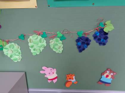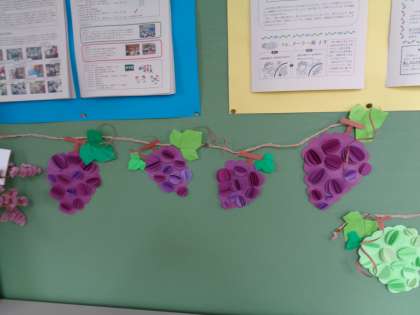 職員室前の掲示が変わりました。秋らしくなっています。美味しそうなブドウが飾られています。