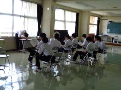 3年生の音楽です。2学期に合唱コンクールがあるので、女子はパート分けをしていました。担任の先生も一緒に参加しています。男子は、パート練習をしていました。