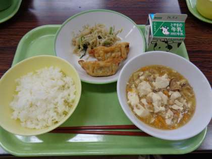 2学期最初の給食です。メニューは、ごはん、牛乳、揚げぎょうざ、塩ナムル、マーボー豆腐でした。美味しくいただきました。