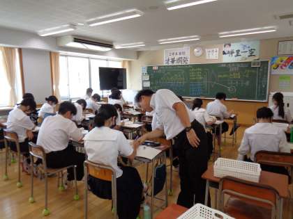 2年生の様子です。数学と保健体育です。数学では、各自真剣に問題に取り組んでいます。保健体育は、振り返りの時間でした。