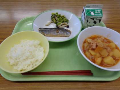 今日のメニューは、ごはん、牛乳、にしんの照り煮、ブロッコリーときのこのソテー、トマト肉じゃがでした。美味しくいただきました。