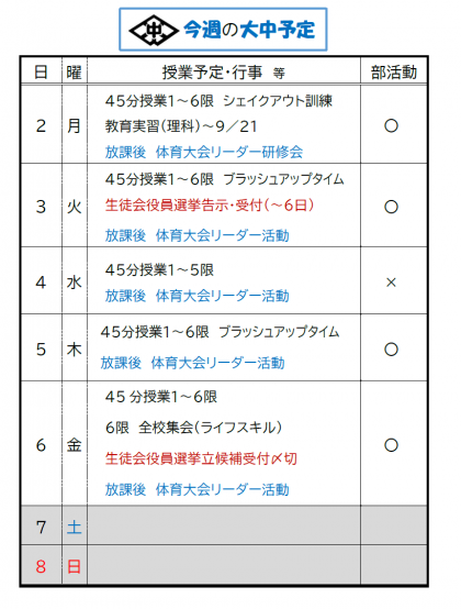 28日(土)に行われる体育大会に向けて、今週からリーダーを中心に活動が始まります。