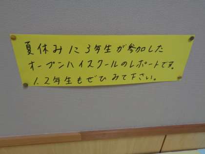 3年生の廊下には、オープンハイスクールのレポートが展示されています。1,2年生も見てくださいね。