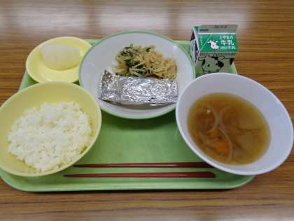 メニューは、ごはん、牛乳、さばの銀紙焼き、はりはり和え、冬瓜スープ、梨でした。放送で梨の説明がありました。もちろん、富山市呉羽の梨です。水分補給にも役立つとのことです。美味しくいただきましょう。