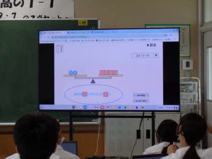 1年生の数学です。天秤を使って、両辺の増減について考えています。
