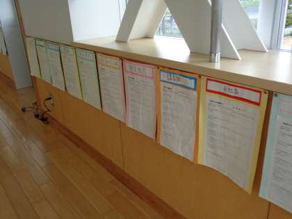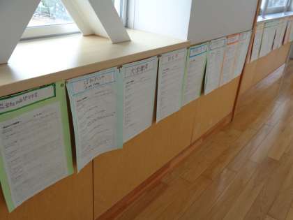 1年生の教室前の掲示です。夏休みの課題「身近な人の職業調べ」が掲示されました。いろいろな職業について、インタビューなどをして調べ、分かりやすくまとめています。
