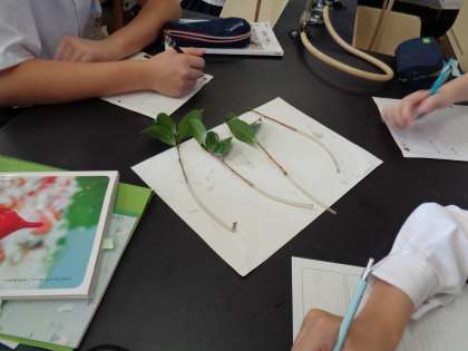 理科の授業です。昨日から実験をしていた蒸散の結果を確認しました。結果から分かることを記入しています。