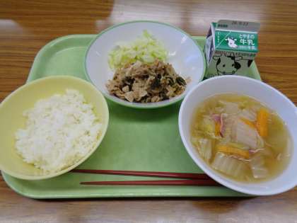 今日のメニューはごはん、牛乳、豚キムチ丼、ゆでキャベツ、はくさいスープでした。美味しくいただきました。