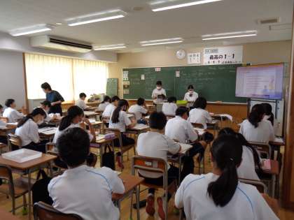 英語の授業です。生徒の本格的な発音の後に続いて、リピートしています。