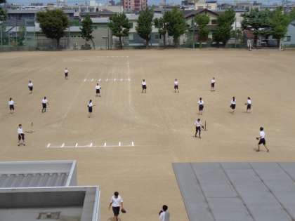保健体育の授業をグラウンドで行っていました。まだまだ暑いので、途中に休憩を挟みながら授業をしています。
