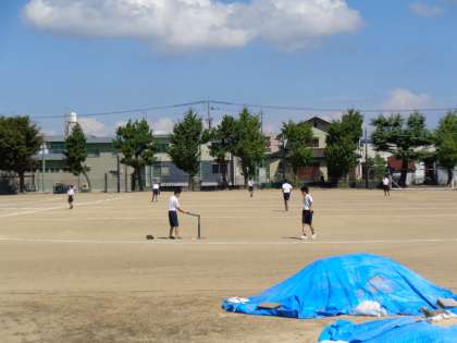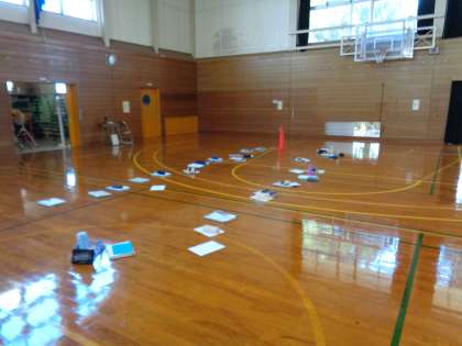 保健体育です。体育館の中に、必要な持ち物を整然と置いて、グラウンドで活動しています。
