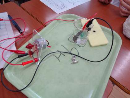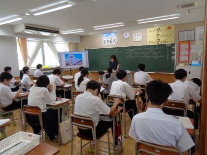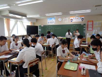 英語と理科の授業です。理科ではダニエル電池を作って、モーターをまわしていました。実習生の先生と数名の先生が授業に参加していました。実習生の先生は今週までです。