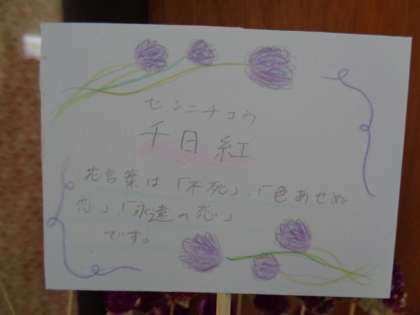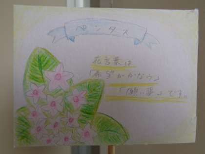 お花のカードです。植物名だけでなく、花言葉も書いてあります。ペンタスの花言葉は「希望がかなう」です。素敵なカード、いつも描いてくれてありがとう!!