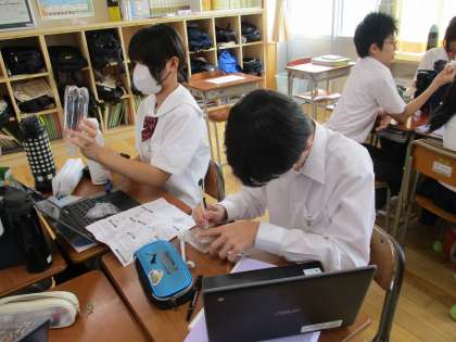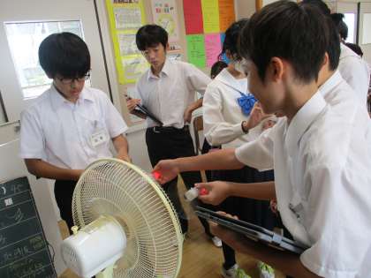 2年技術科の授業で「電気エネルギーを発電しよう〜風力発電を体験しよう〜」を行いました。今日は2−1が体験しました。自分の作ったプロペラがきれいにまわり、発電することによってLEDライトが光るのを見て、生徒はとても嬉しそうでした。