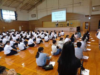 全校集会を公開しました。ライフスキルを小学生も交えて行いました。