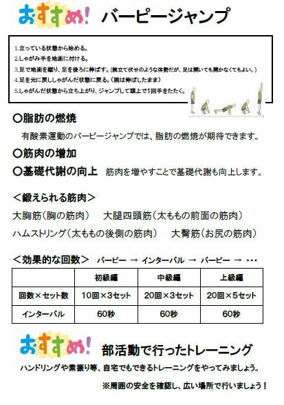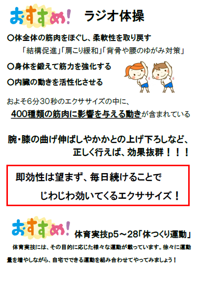 体育実技にも、様々なトレーニングが載っています。体育実技p27、28を参考に、自分や家族の運動計画を立てて、取り組んでみましょう!