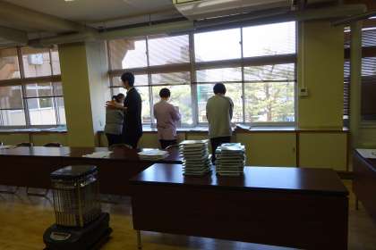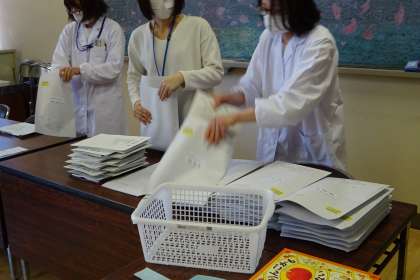 臨時休業中の課題を教職員全員で準備しています。学校に届いた教材やプリント等を各家庭に明日送る予定です。