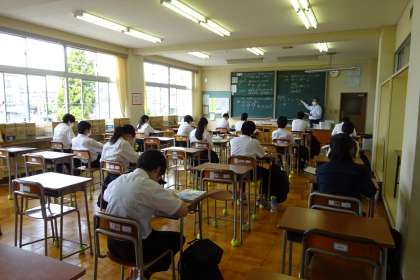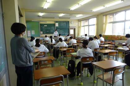 2年生は感染予防のため、1組が美術室、2組が被服室で学習します。午前は出席番号の偶数の生徒が登校しています。密にならないように、間をあけて着席しています。久しぶりの授業ですが、とても集中しています。さすが大中生!!