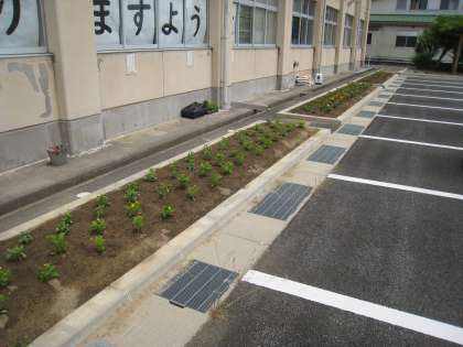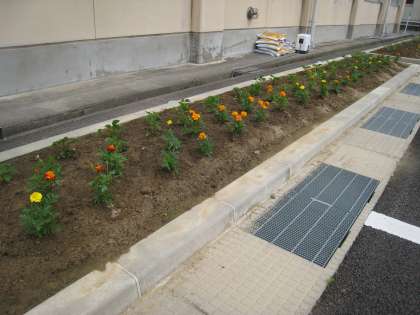 南館前の花壇に花の苗を植えました。