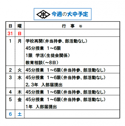 6月1日から学校が再開します。6月9日(火)まで、弁当持参でお願いします。また、気温が高くなっているので、多めに水分を持参しましょう。
