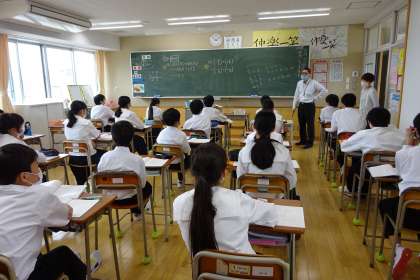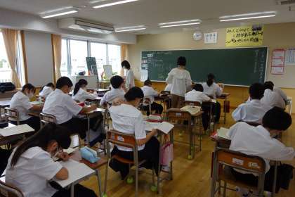 1年1組は英語です。アルファベットを学習しています。1年2組は数学です。最小公倍数を学習しています。どちらの授業も、サポートの先生がついています。分からないところはどんどん質問しましょう。