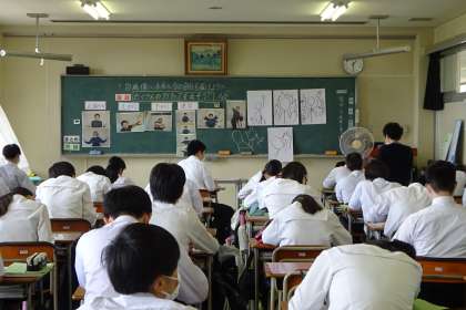 美術の授業で自画像を書きます。いろいろなポーズの写真を見ながら考えています。