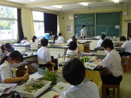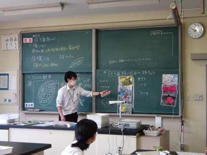 理科室での授業でした。密にならないように、2人で1つのテーブルで観察をしています。双子葉類のつくりを実際に観察して、まとめています。