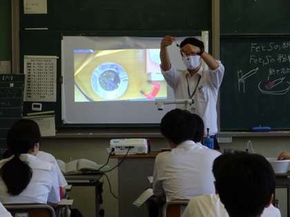 1組は、理科です。先生が前で演示実験をしています。分かりやすいようにスクリーンに映しながら実験しています。