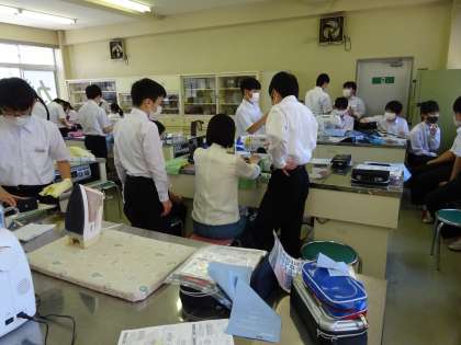 2組は、技術家庭科です。今日は家庭科でミシンを使って、ティッシュボックスカバーを作成しています。