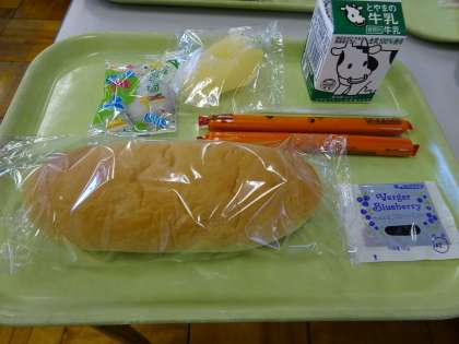 今日から簡易給食が始まりました。メニューは、コッペパン、牛乳、ウインナーソーセージ、かしわもち、冷凍リンゴ、ブルーベリージャムです。きれいに手を洗ってから、おいしくいただきましょう。