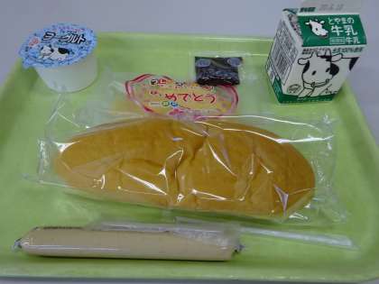 今日も簡易給食でした。メニューはコッペパン、牛乳、魚肉ソーセージ、クレープ、ヨーグルト、チョコレートクリームです。クレープには、入学お祝いのメッセージがあります。