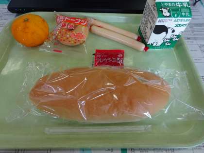 今日の給食です。メニューは、コッペパン、牛乳、チーズかまぼこ、豆乳ドーナツ、冷凍ミカン、いちごジャムです。