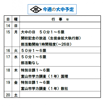 今週から部活動が始まります。当面、16:45まで活動、17:00下校完了です。なお、毎週水曜日は部活動はありません。(変更があれば、お知らせします。)